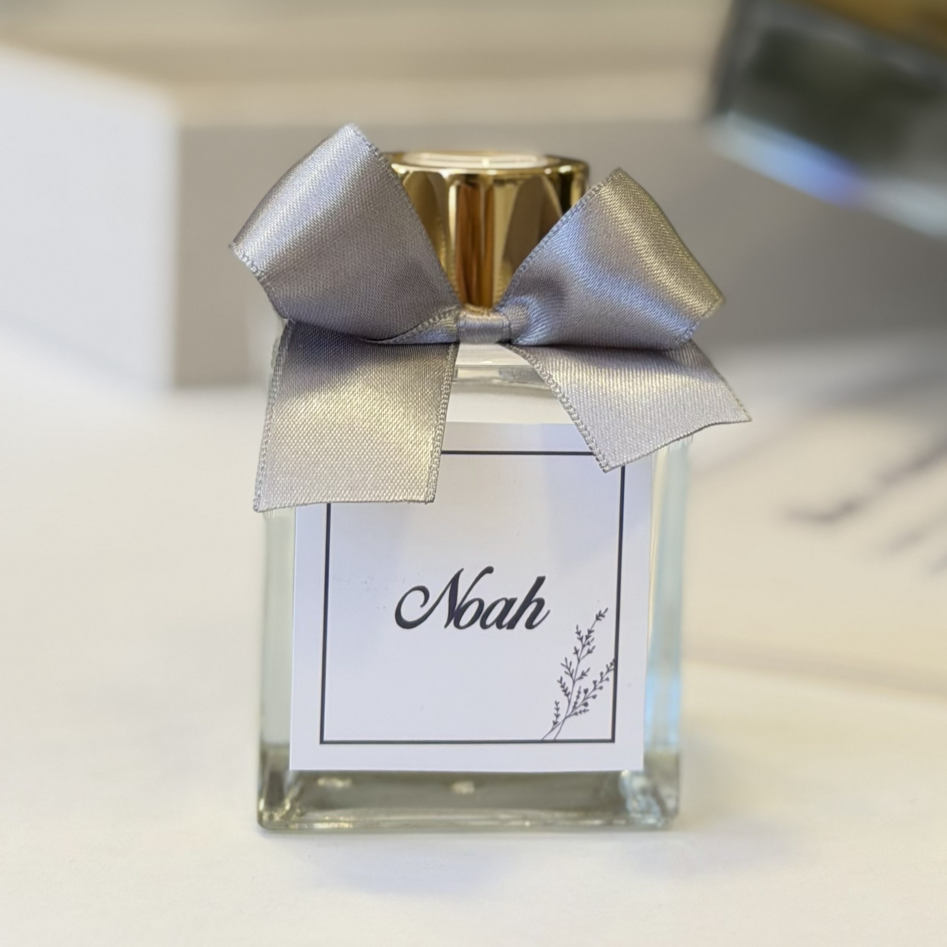 Aromatizador em vidro cubo 50ml com aroma infância, decorados com laço em cetim e adesivo.
