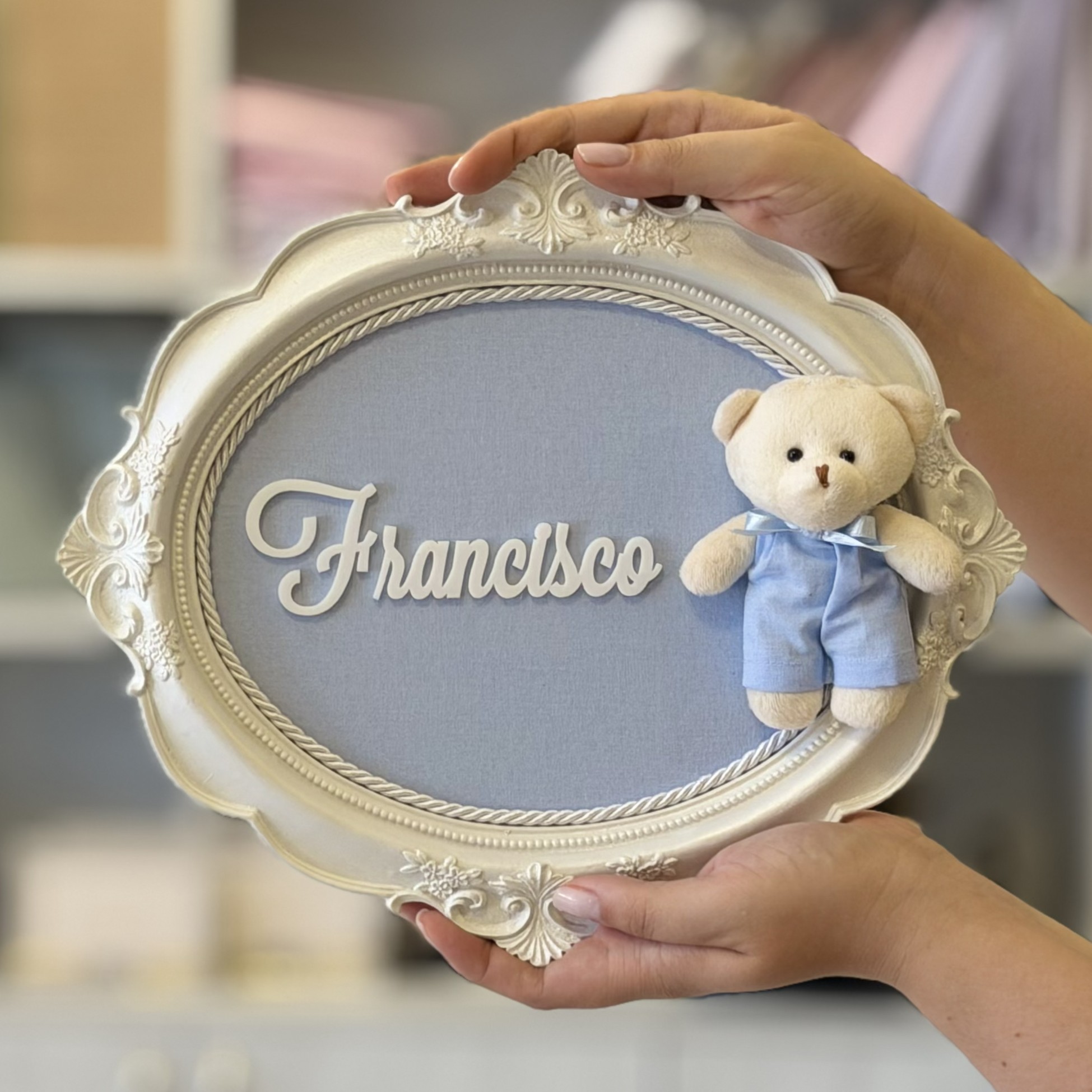Guirlanda maternidade perolada em estilo provençal, produzida em resina, fundo revestido em tecido 100% algodão e decorado com cordão São Francisco. Destaque para o nome personalizado produzido em acrílico e pintado em cor que compõe com o fundo em tecido. A peça é complementada por um ursinho com roupinha em tecido 100% algodão.